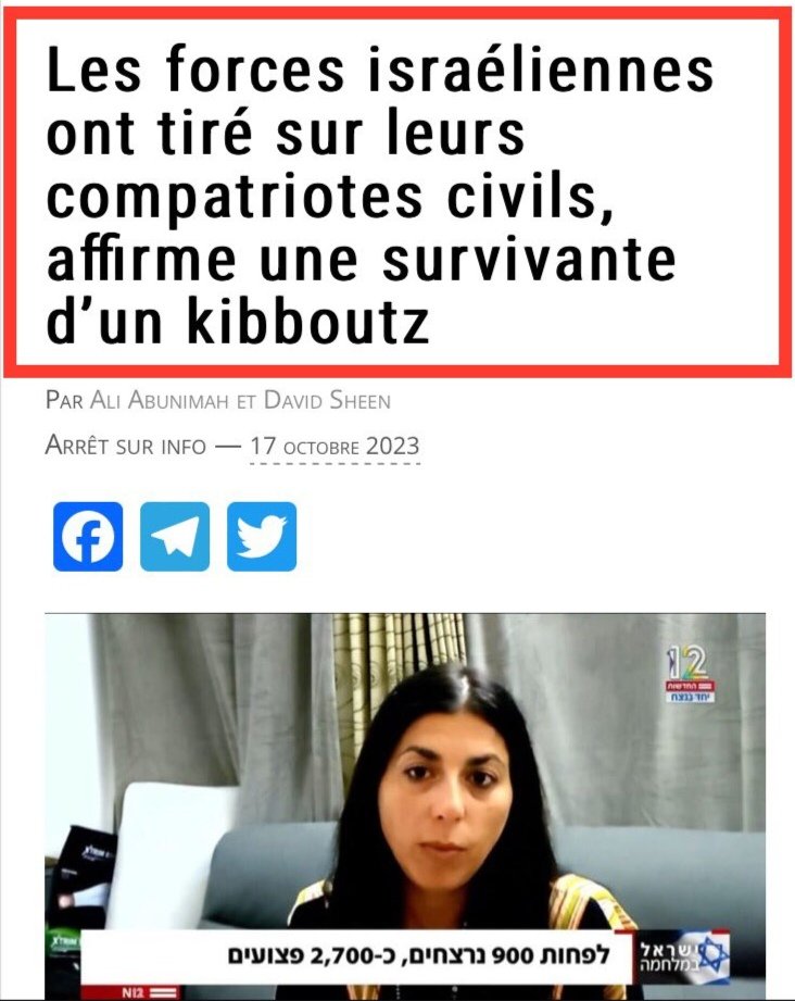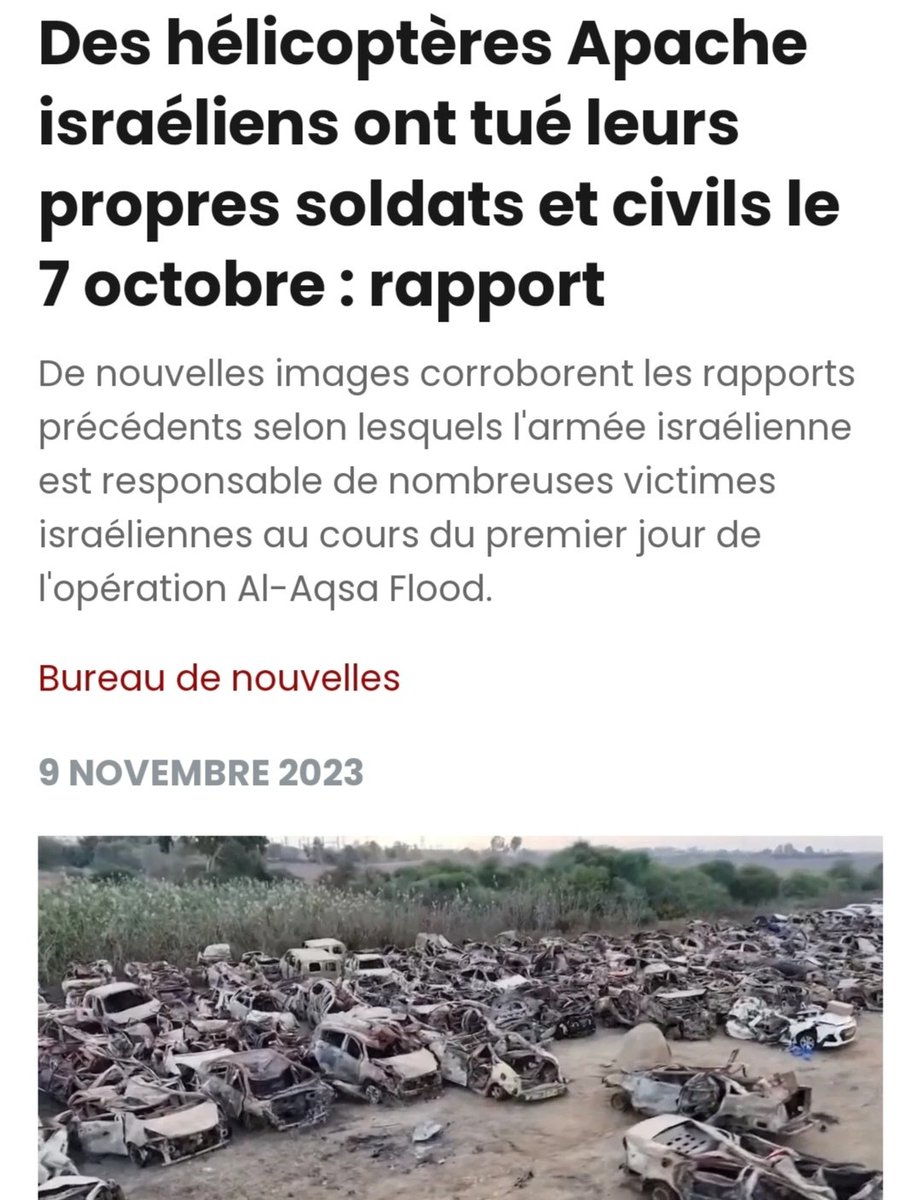 Le site d'information israélien YNET a publié des images d'hélicoptères Apache israéliens bombardant des civils en fuite au Festival de musique Supernova. Des bombes ont été larguées par des hélicoptères israéliens sur des centaines de civils et de véhicules tentant de s'échapper sur le terrain vide. Vingt-huit hélicoptères de combat israéliens ont tiré toutes les munitions qu’ils détenaient, y compris des centaines d’obus de 30 mm et des missiles Hellfire au cours de la journée. Les équipages de chars ont reçu l’ordre de bombarder les maisons, sans tenir compte des otages israéliens potentiellement présents à l’intérieur. Ce qui est confirmé par d’autres vidéos provenant de l’intérieur des kibboutz montrant des cadavres couverts de décombres suite aux obus. Haaretz, Middle East Monitor et The Grayzone confirment que les forces israéliennes ont bombardé les maisons de leurs propres citoyens, entraînant un nombre incalculable de morts israéliennes évitables. Une Israélienne, Yasmin Porat, qui a survécu à l’offensive du Hamas le 7 octobre, affirme que des civils israéliens ont "sans nul doute" été tués par leurs propres forces sécuritaires. "Ils ont liquidé tout le monde, y compris les otages". D'autres images encore, filmées à l'intérieur des kibboutz, montrent une dévastation absolue qui ressemble aux bombardements répétés de Gaza par Israël au fil des années. Certaines des photos les plus horribles du gouvernement israélien, montrant des cadavres carbonisés et des "corps brûlés au point d'être méconnaissables", pourraient donc en réalité représenter des victimes infligées par Israël. https://yenisafak.com/video-galeri/gundem/israil-supernova-muzik-festivalinde-sivilleri-bombaladi-goruntuler-ortaya-cikti-4573717?utm_source&utm_medium=social&utm_campaign… + https://aubedigitale.com/les-sequences-filmees-par-un-helicoptere-relancent-le-debat-sur-les-incidents-de-tir-ami-israeliens/ + https://mondoweiss.net/2023/10/a-growing-number-of-reports-indicate-israeli-forces-responsible-for-israeli-civilian-and-military-deaths-following-october-7-attack/?utm_content=buffer550ff&utm_medium=social&utm_source=twitter&utm_campaign=buffer… + https://thegrayzone.com/2023/10/27/israels-military-shelled-burning-tanks-helicopters/ + https://middleeastmonitor.com/20231030-report-7-october-testimonies-strikes-major-blow-to-israeli-narrative/ + https://groupegaullistesceaux.fr/2023/11/10/des-helicopteres-apache-israeliens-ont-tue-des-soldats-et-des-civils-le-7-octobre-rapport/ + https://ynetnews.com/article/hkanmp5w6 +https://archive.md/JtyES#selection-873.0-873.346… + https://arretsurinfo.ch/les-forces-israeliennes-ont-tire-sur-leurs-compatriotes-civils-affirme-une-survivante-dun-kibboutz/ + https://electronicintifada.net/content/israeli-forces-shot-their-own-civilians-kibbutz-survivor-says/38861 Vidéos : https://youtu.be/3cPeRSVgUpQ https://youtu.be/fghF54maONw + https://youtu.be/fghF54maONw + https://twitter.com/Am46Med/status/1724399714362065175?t=DwhzrTugqDtoavLLneOkVQ&s=19… + https://twitter.com/Partisangirl/status/1722527493780021654?t=5xCOoYK_TuuLRN8Dyc0nKA&s=19…