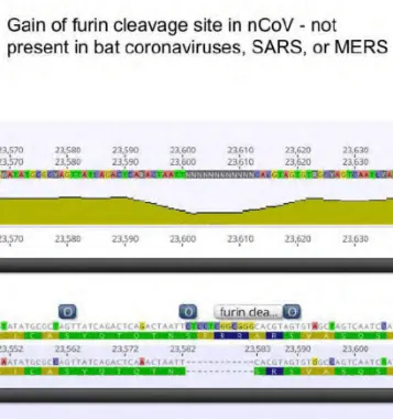 Fauci fw'd KGA slides (coronavirus sequence comparison) showing RaTG13 alignment, exposing Baric's RRAR furin cleavage site in SARS2 a blind man can see it...