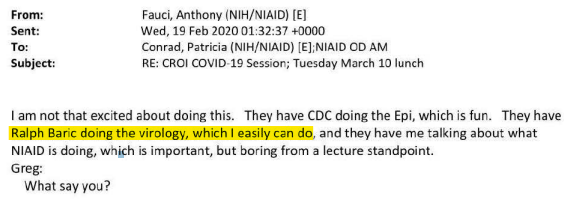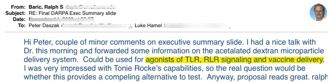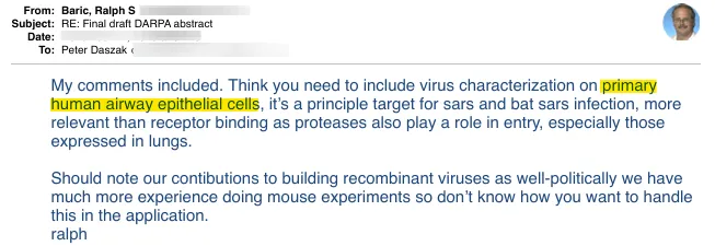 DARPA had invited Shi Zhengli to Washington, D.C. Shi and Daszak then invited Baric to join their DARPA Defuse team, because they needed his expertise in "manipulating coronaviruses" Baric replied, "Marvelous opportunity. Count me in."