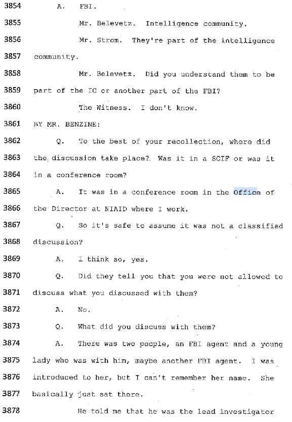 FBI questioned me in a conference room in the office of Director at NIAID where I work