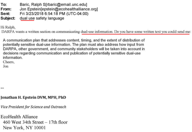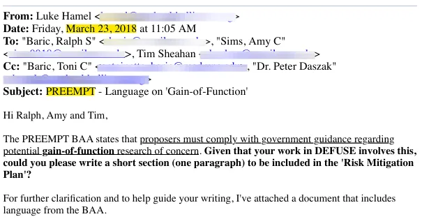 Baric provided DARPA with the dual-use language: We are experimenting with bat viruses, not human viruses, so no GoF concerns (notice the March 23, 2018 email and section TA1 & TA2, since it's important later)