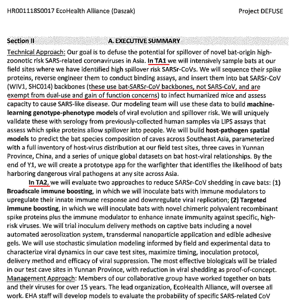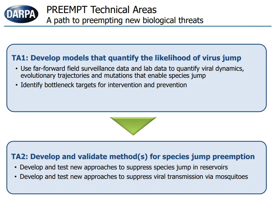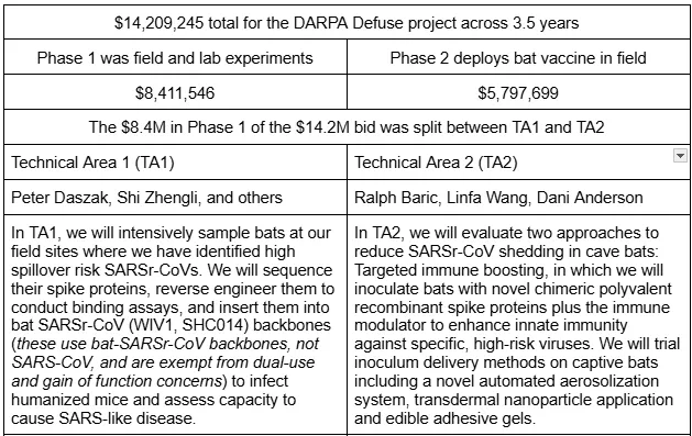 All DARPA bids were broken into 2 major parts: Technical Area 1 and 2, or TA1 and TA2 TA1 = collect in-country bat samples TA2 = create countermeasures (i.e. bat vax or targeted immune boosting) https://web.archive.org/web/20181201030626/https://www.darpa.mil/attachments/PREEMPTOverview.pdf