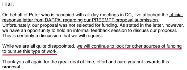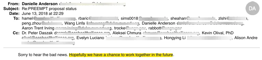 DARPA said they were too risky and too expensive, so Luke Hamel of EcoHealth told the Defuse team, "We will continue to look for other sources of funding to pursue" Dani Anderson replied, "Hopefully we have a chance to work together in the future"