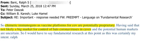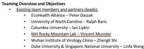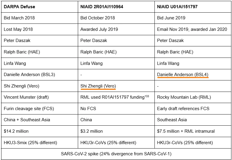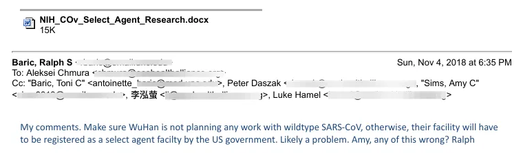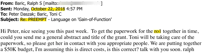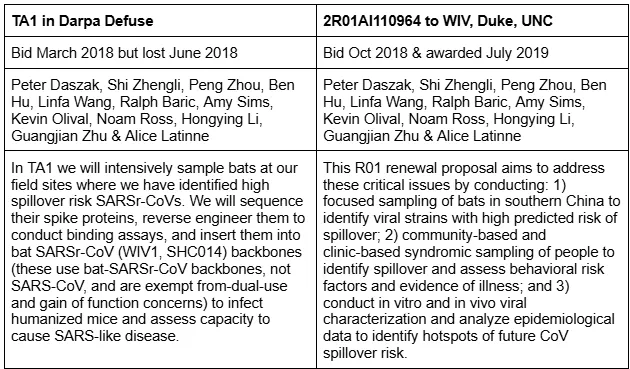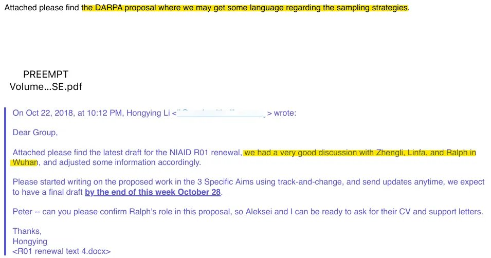 On October 21, 2018, the rejected DARPA team met at the Wuhan Institute of Virology the next day, Baric emailed Daszak with the idea of recycling the rejected TA1 bid into a NIAID R01 grant Baric even used the March 2018 DARPA Defuse email chain to continue their NIAID plans
