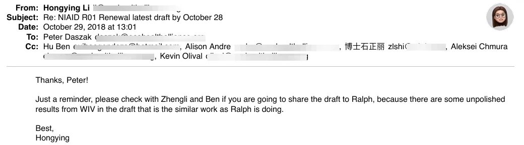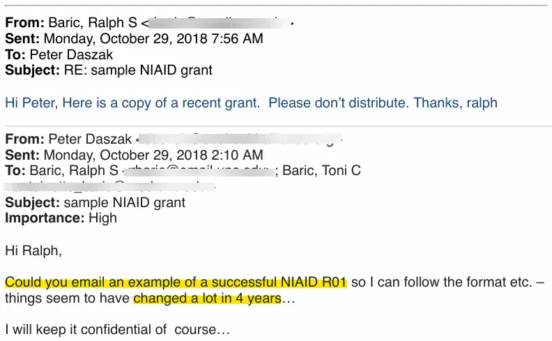 Daszak’s Mandarin-speaking assistant, Hongying Li, was explicit in her English: We are recycling DARPA text They add Baric to the 2018 R01 Wuhan grant renewal and “unpublished results from WIV” Why Baric? He wins grants from NIAID, which are comfortable with his GoF research