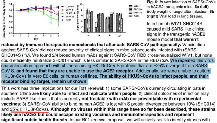 Daszak used Shi's 2018 progress report as a R01 grant renewal format. Baric added the highlighted R01 text: HKU3-Smix from DARPA Defuse is now HKU3r-CoV in NIAID. Both have 25% different spikes from SARS1, like SARS2.