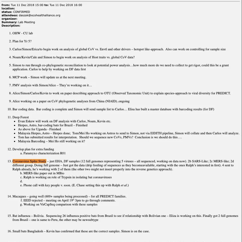 Did Daszak share RaTG13 from Shi to Baric for the new 2R01 NIAID grant? Yes Daszak's Dec 2018 notes, "Just got data (from WIV) drip feeding (2b) sequences as they become available, starting with the ones Ralph's interested in first" that's ~25% different spikes, like RaTG13