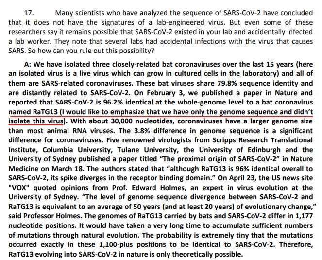 Shi said she never isolated RaTG13, but Baric could resurrect it based on an emailed sequence https://www.science.org/pb-assets/PDF/News%20PDFs/Shi%20Zhengli%20Q&A-1630433861.pdf
