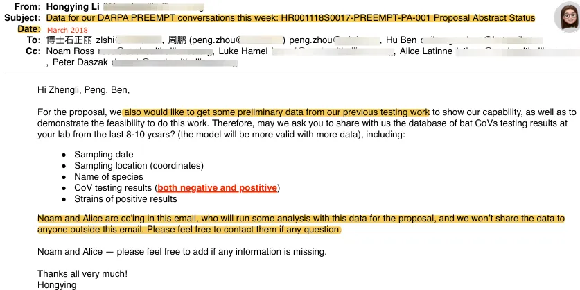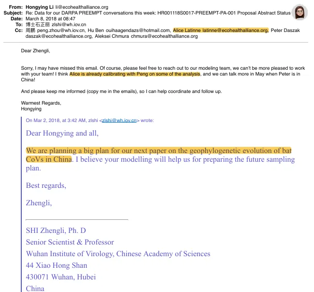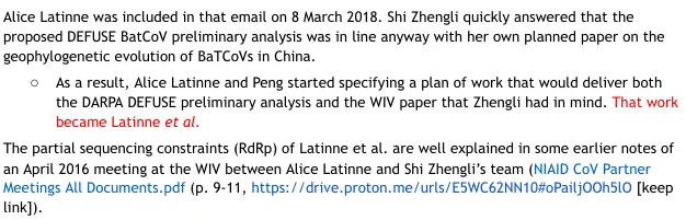 In 2018, EcoHealth asked Shi for unpublished coronavirus samples from her WIV database. Shi replied yes, but her WIV database release would become part of a “big plan for our next paper.” that was Latinne et al
