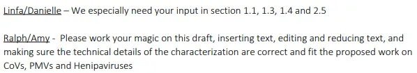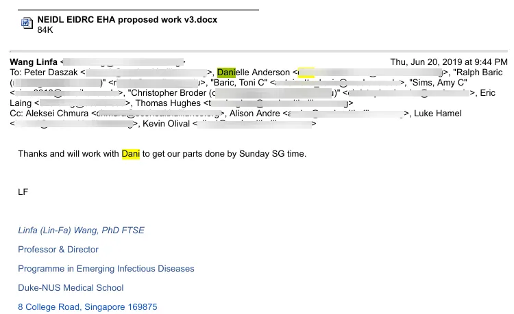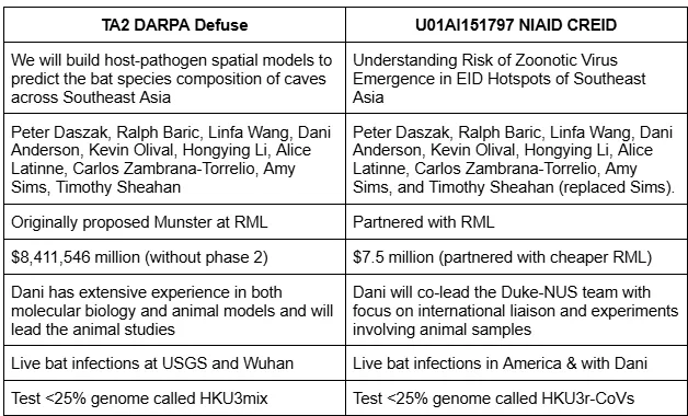 Daszak divied up the U01 NIAID bid tasks. Linfa Wang, Dani Anderson, Amy Sims, and Ralph Baric were the primary scientists from TA2 in DARPA Defuse Dani replied, "I know we took a lot of text from our (DARPA Defuse) grant proposal"