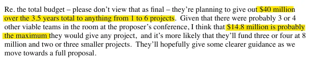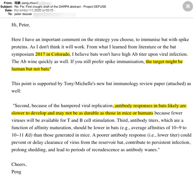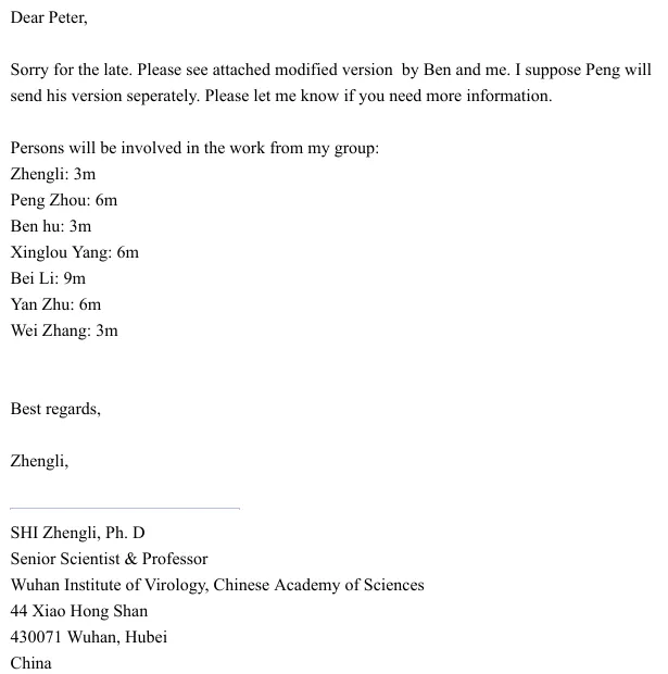 Shi only responded once to all the DARPA Defuse draft emails, providing Daszak a manhour budget (~10% of budget) Peng Zhou is Linfa's bat immunology protege, who only asked a few questions Daszak bid max $14.2M amount