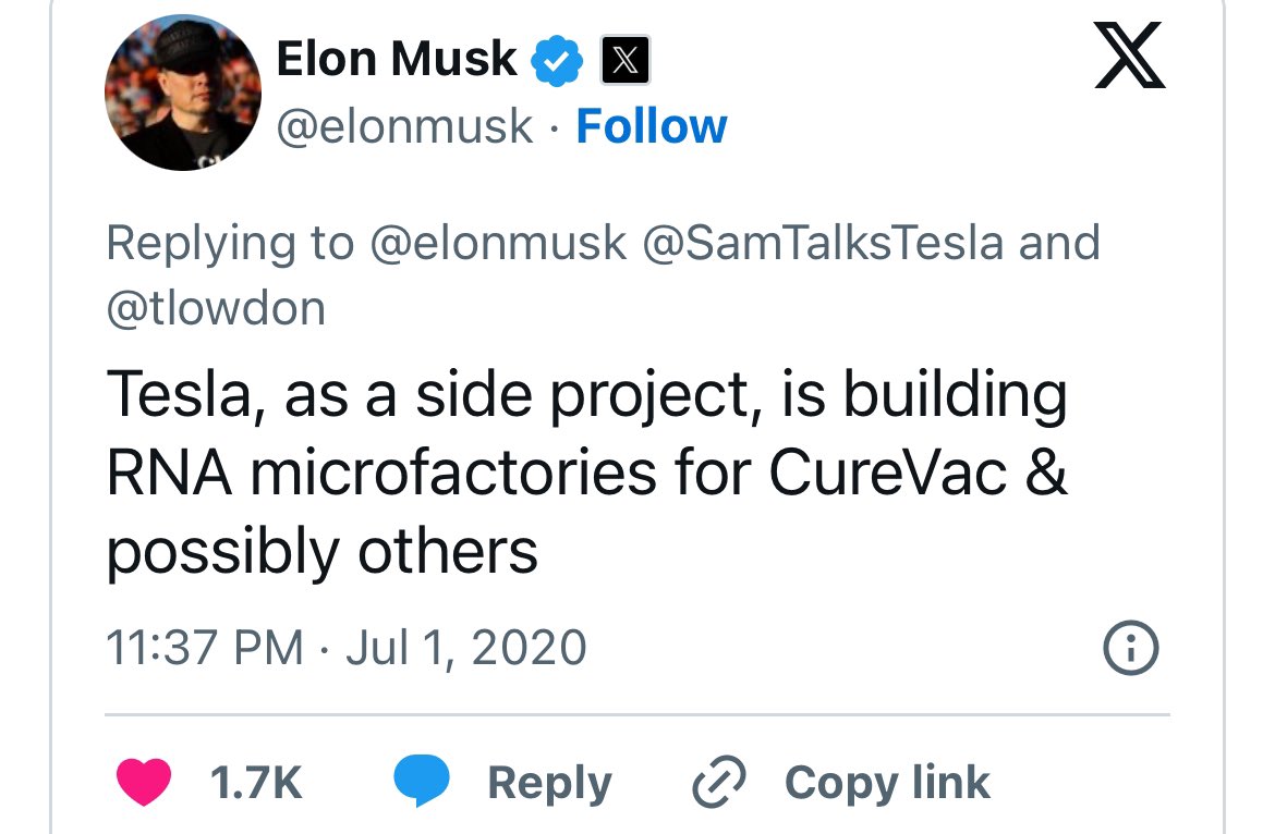 Tesla CEO Elon Musk tweeted Thursday that the electric carmaker had signed on with CureVac to make portable molecular RNA printers—what Musk appeared to refer to as "RNA microfactories"—to help produce doses of the German vaccine maker's COVID-19 shot candidate. 🤔 https://t.co/ScZt4wWhpv