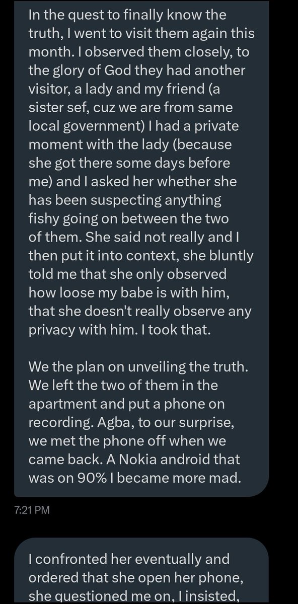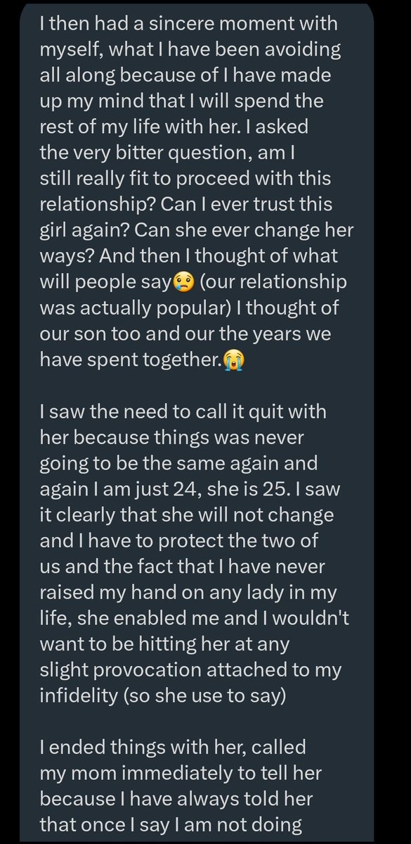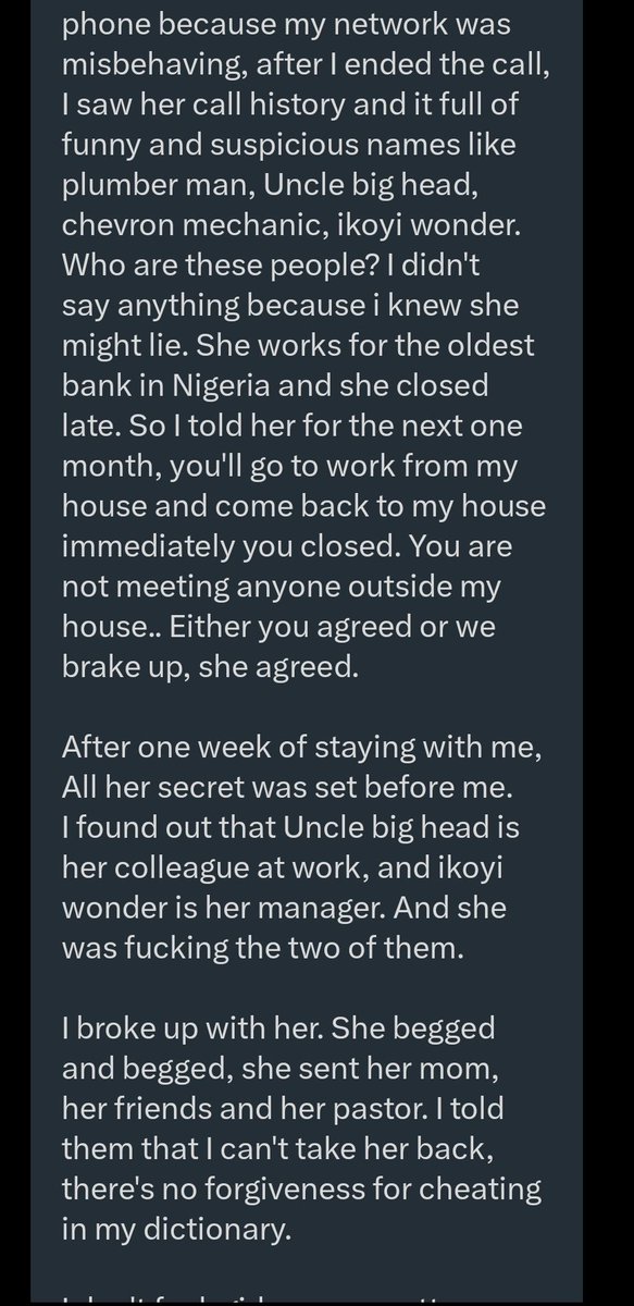 decides to cheat back, will not let her. But she will take vengeance on you. And if you're not careful, you'll raise another man's child. And she will tell you that she didn't tell you it was your child. You just assumed it was yours because you are married to her. End.