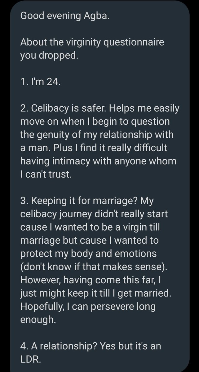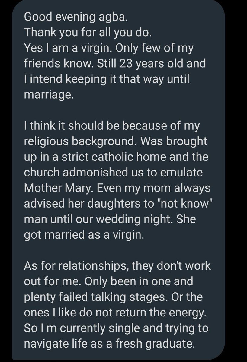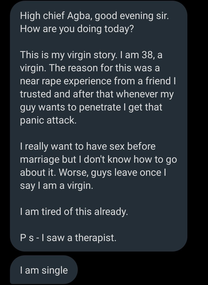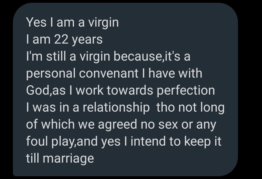 Thread on single women that are still virgins. 1) how old are they? 2) why are they still virgins? 3) do they intend to keep it till marriage? 4) are they in a relationship? 1. She's a virgin at 38. https://t.co/zxST14BU1q