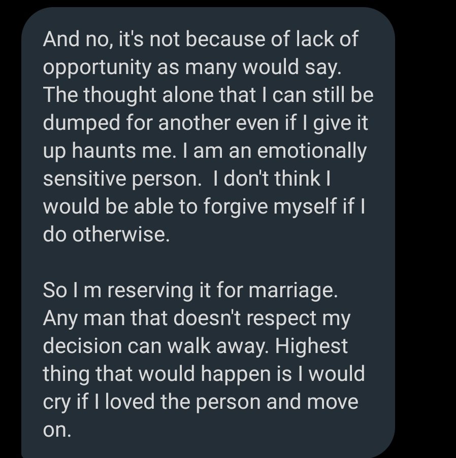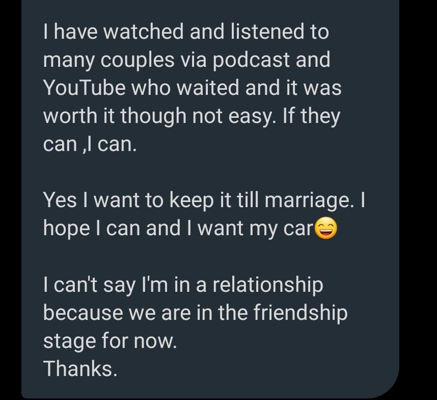 time and patience. So the whatsapp chat we are discussing can be looked at, in different ways. 1) The man was honest to his reality, knowing full well that he wasn't ready. So instead of leading her on, and taking the risks, he decided to let her go. 2) if he had decided not