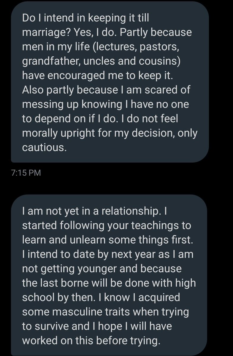 and marriages packed up. For me, I've strived hard to balance things up between genders. I've not made the teachings one-sided because I know that men and women need each other. So when I read from some young men, I tend to want to consider women who allege that