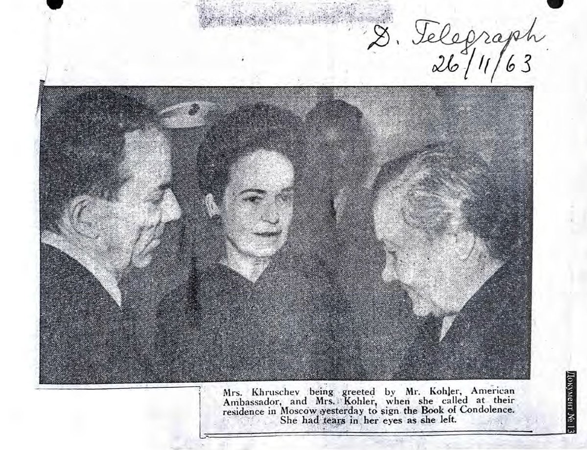 From Soviet documents on JFK assassination obtained by @RepLuna👇 Mrs. Khrushchev being greeted by Mr. Kohler, American Ambassador, and Mrs. Kohler, when she called at their residence in Moscow yesterday to sign the Book of Condolence. She had tears in her eyes as she left. https://t.co/Sw1LqQuP47