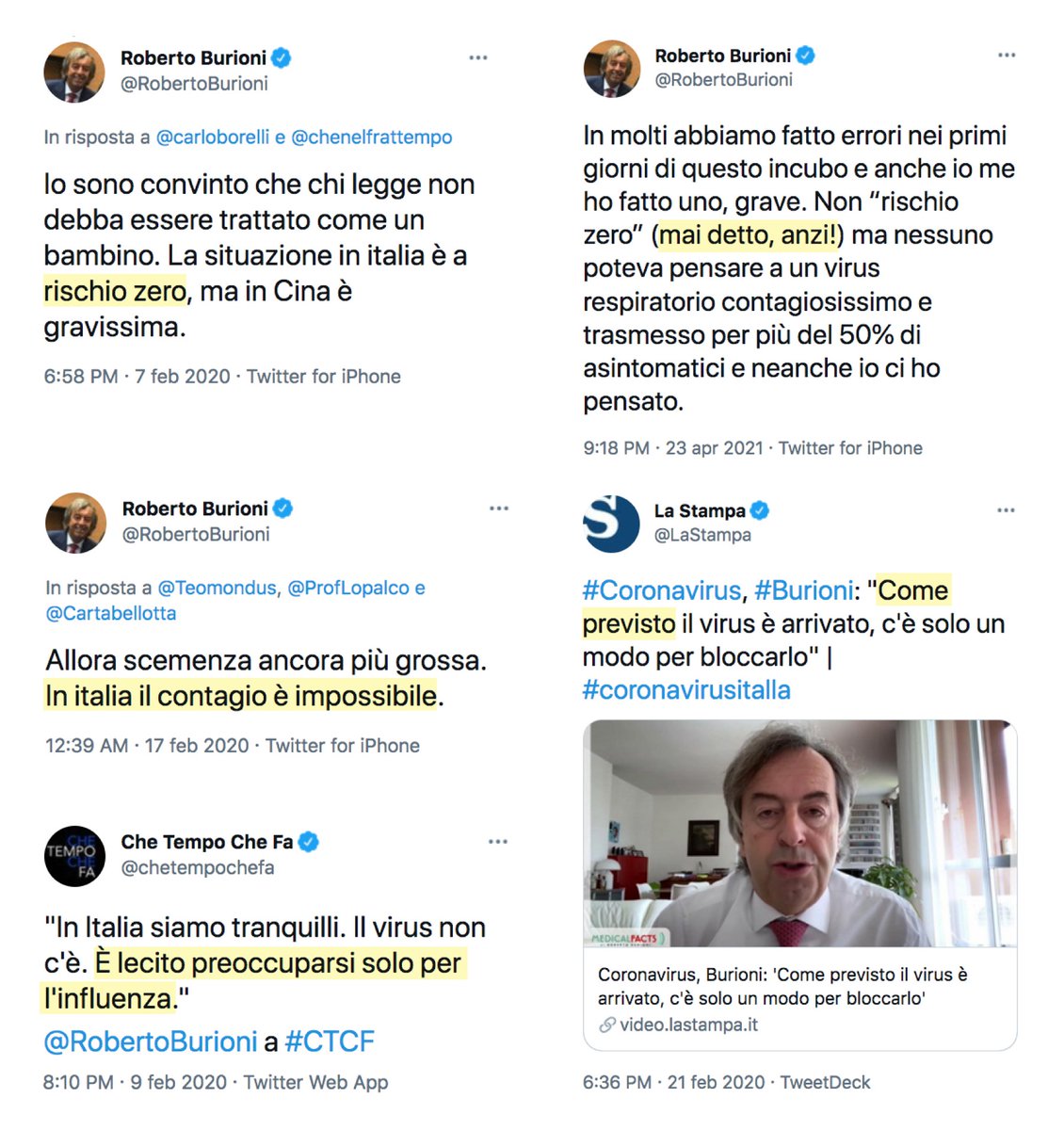 Burioni 1: "In Italia rischio zero." Burioni 2: "In Italia il contagio Γ¨ impossibile." Burion 3: "Γ lecito preoccuparsi solo dell'influenza." Burioni 4: "Come previsto il virus Γ¨ arrivato." Burioni 5: "Mai detto rischio zero." Burioni Γ¨ un clown π€‘ professionalmente fallito. https://t.co/0l7dNjv1rX