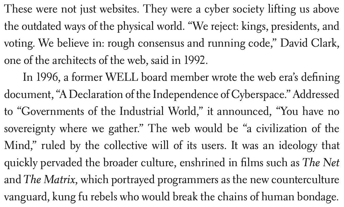 @jilliancyork I can’t find it but hive mind - how the 1970s (white) hippie cultural was functionally highly patriarchal and how that informed the racist, misogynist “change the world” culture of the Bay that venerates the lone white male genius/savior archetype of SV.