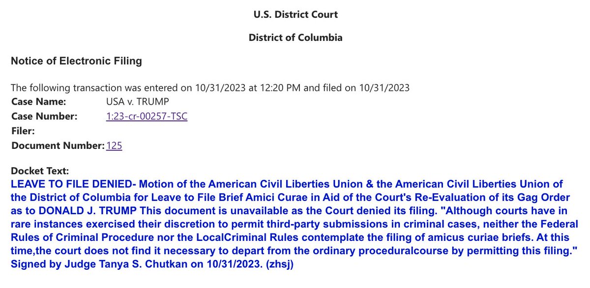 JUST IN: Judge Chutkan, as she's done for every outsider filing so far in the Trump case, has denied the ACLU's effort to submit an amicus brief related to the gag order (which the ACLU has publicly opposed) https://t.co/L6U42Ntxs3