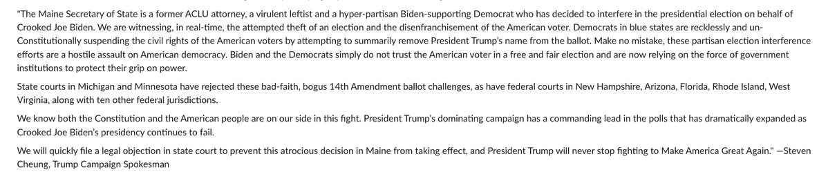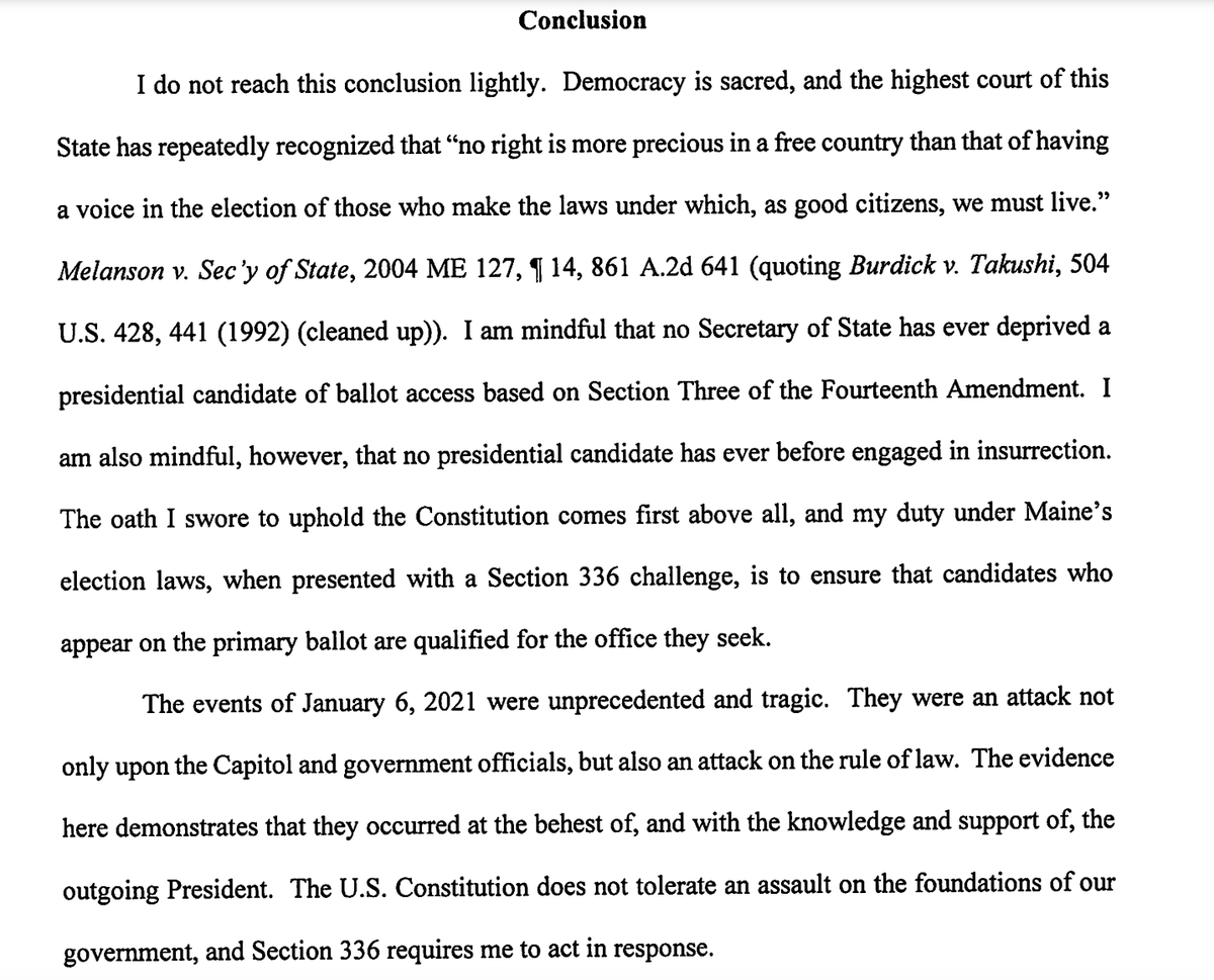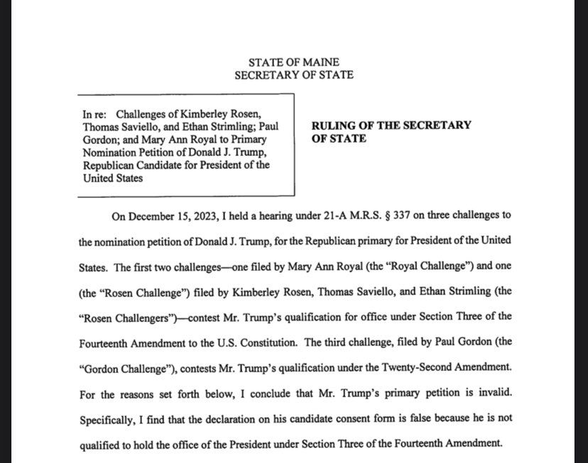 BREAKING: Maine Secretary of State rules Trump is ineligible to appear on 2024 ballot. 34-page decision: https://maine.gov/sos/news/2023/Decision%20in%20Challenge%20to%20Trump%20Presidential%20Primary%20Petitions.pdf…