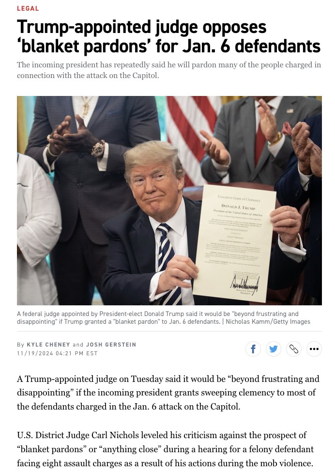 NEW: Judge Nichols criticism of a blanket J6 pardon came as he and federal prosecutors struggled at length over how factor Trump's election into their efforts to efforts to bring Jan. 6 cases to trial. https://www.politico.com/news/2024/11/19/trump-judge-january-6-pardons-00190477