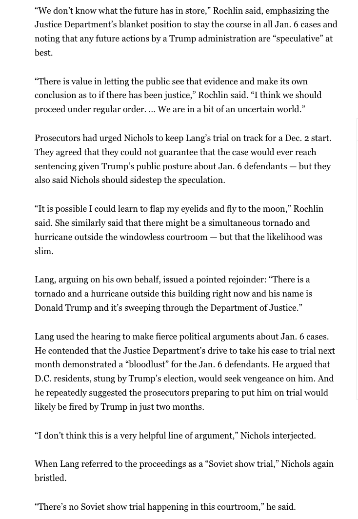 HAPPENING NOW: U.S. District Judge Carl Nichols (a Trump appointee) reluctantly postponed a Jan. 6 felony trial today but sent a clear message to Trump: "“Blanket pardons for all Jan. 6 defendants would be beyond frustrating and disappointing." Details TK