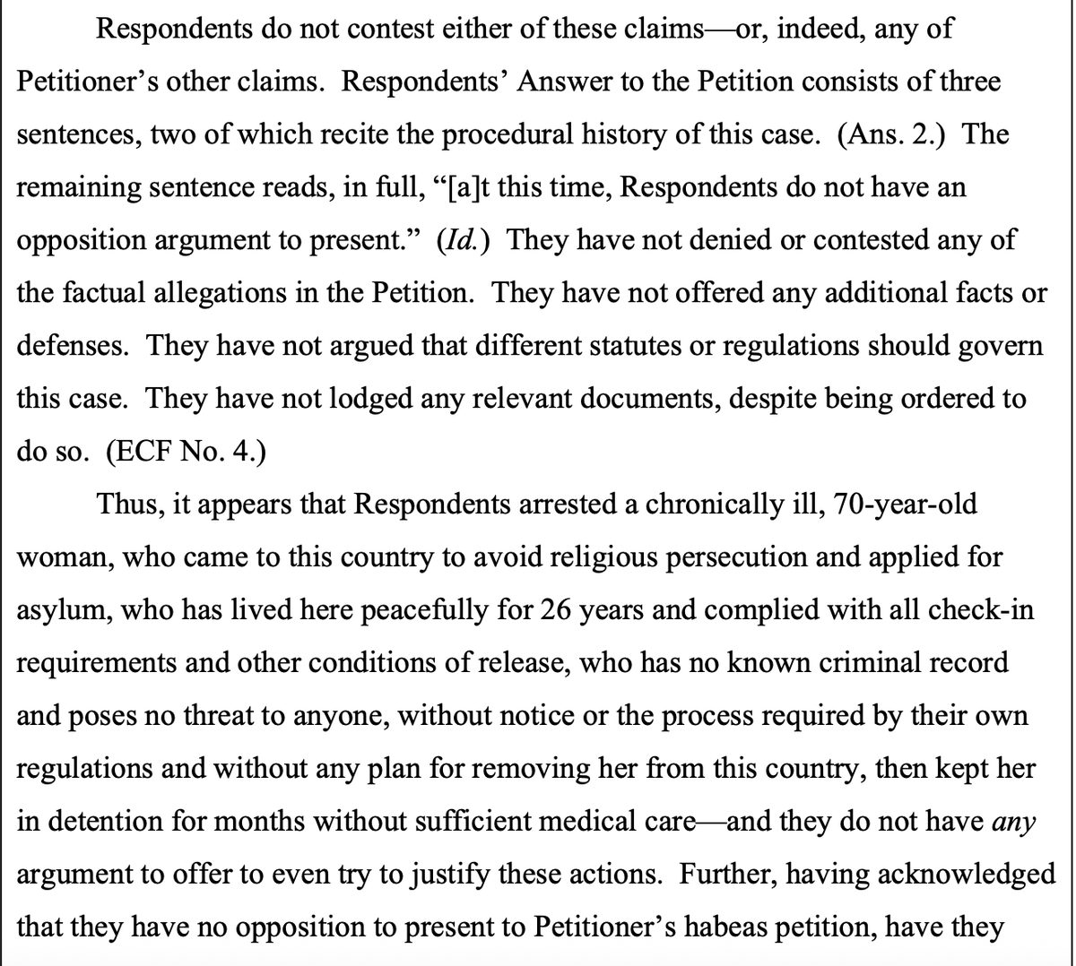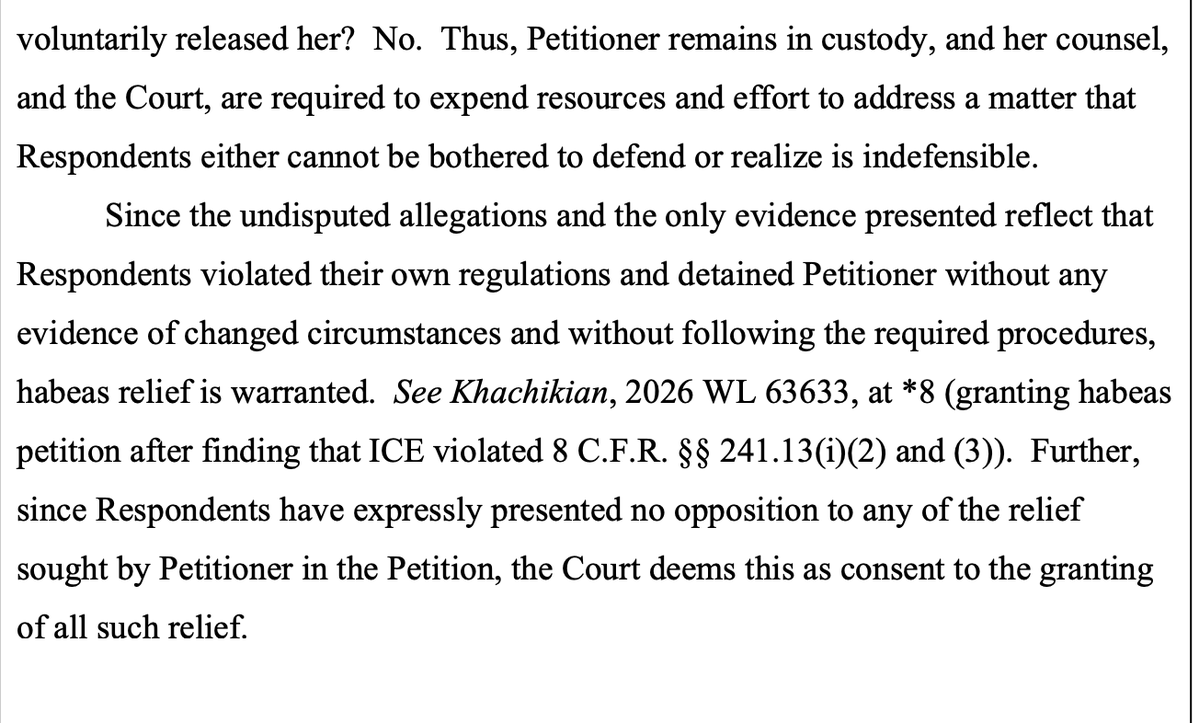 Since July, I've tracked at least 2,300 cases in which federal judges have ruled ICE has illegally detained people without bond or due process. This is one that stands out: https://storage.courtlistener.com/recap/gov.uscourts.cacd.1000677/gov.uscourts.cacd.1000677.8.0.pdf