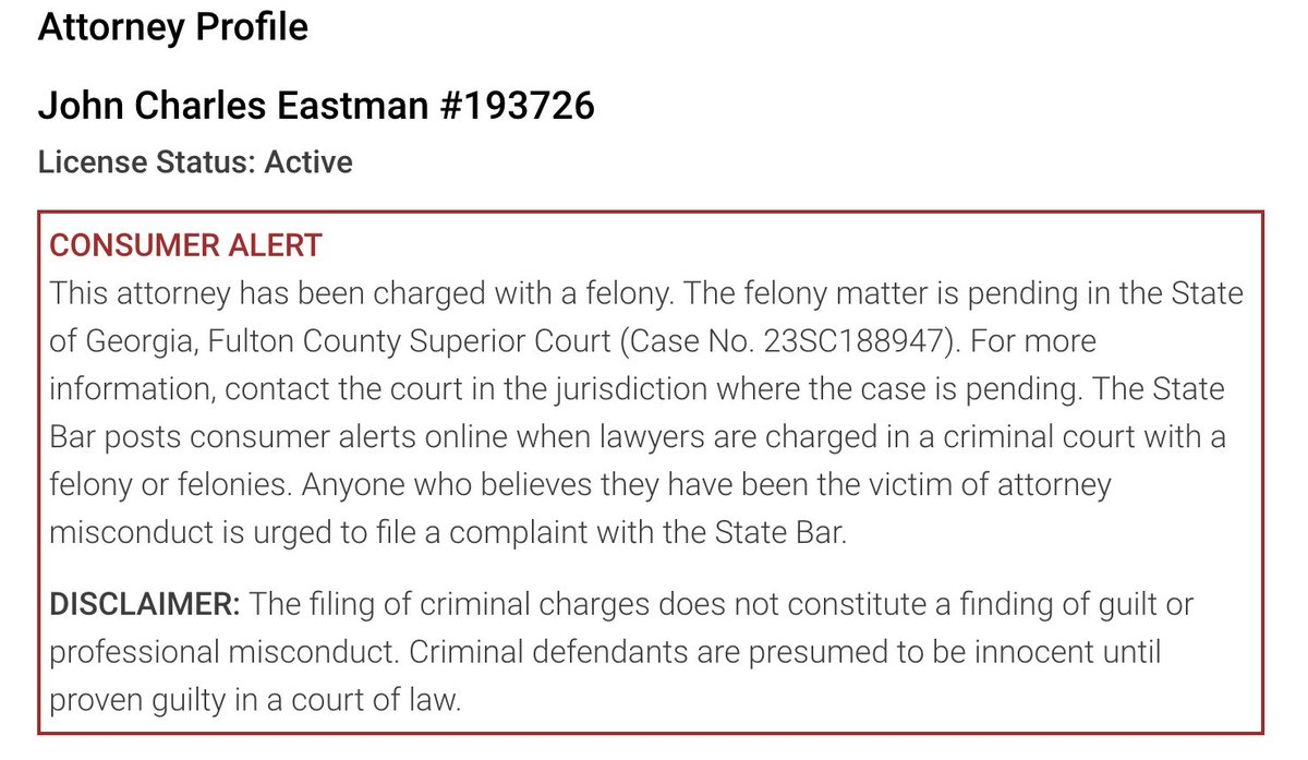 EASTMAN's attorney status in California has been updated to reflect that he's both charged with felonies in Georgia and marked for "inactive" status beginning Saturday as a result of his disbarment ruling.