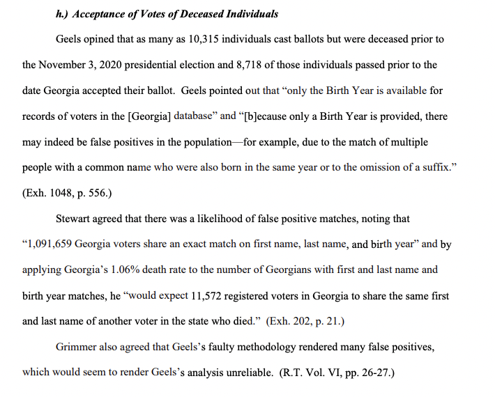 1) Deceased voters in Georgia: The data Eastman used to claim 10,315 dead people voted did not account for high likelihood of false positives. https://www.politico.com/news/2024/03/27/john-eastman-disbarred-00149468