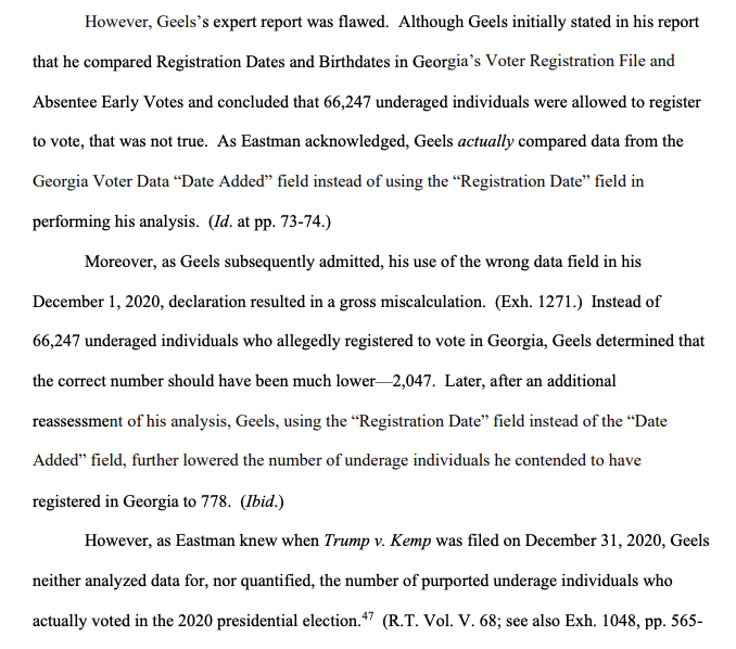 3) Underage registrations: Eastman relied on data claiming 66,247 underage registrants, but it turned out to be based on an error and revised down to 778. It's not clear whether any of these 778 actually voted in 2020. https://www.politico.com/news/2024/03/27/john-eastman-disbarred-00149468