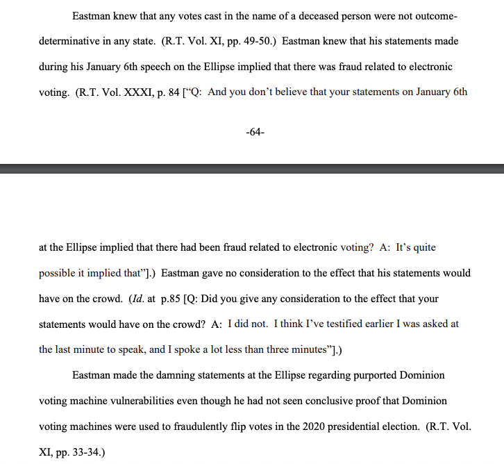6) Eastman's Jan. 6 remarks on the Ellipse implied Dominion voting machine fraud even though he had seen no "conclusive" evidence that such fraud occurred. As she repeatedly noted, Judge Roland said Eastman simply accepted favorable claims and ignored more persuasive rebuttals.