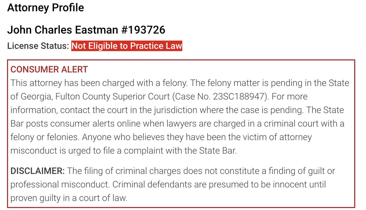 UPDATE: John Eastman's official status with the California bar has been updated to reflect his inability to practice law in California: https://apps.calbar.ca.gov/attorney/Licensee/Detail/193726