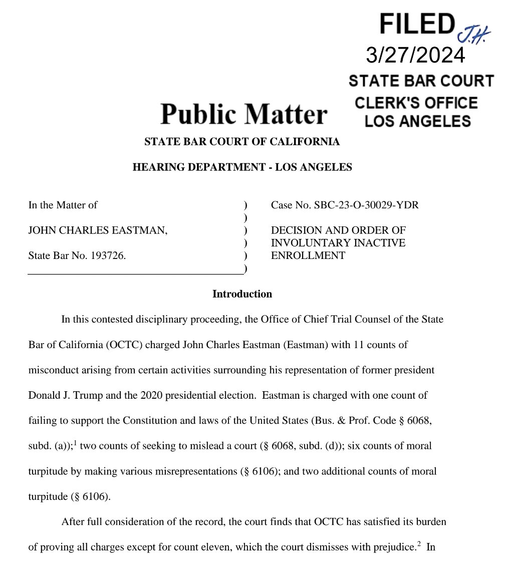 Though Eastman cannot practice law anymore, he is NOT technically disbarred yet. This is the start of a process leading to the CA Supreme Court. Eastman can (and surely will) appeal Roland's ruling. https://www.politico.com/news/2024/03/27/john-eastman-disbarred-00149468