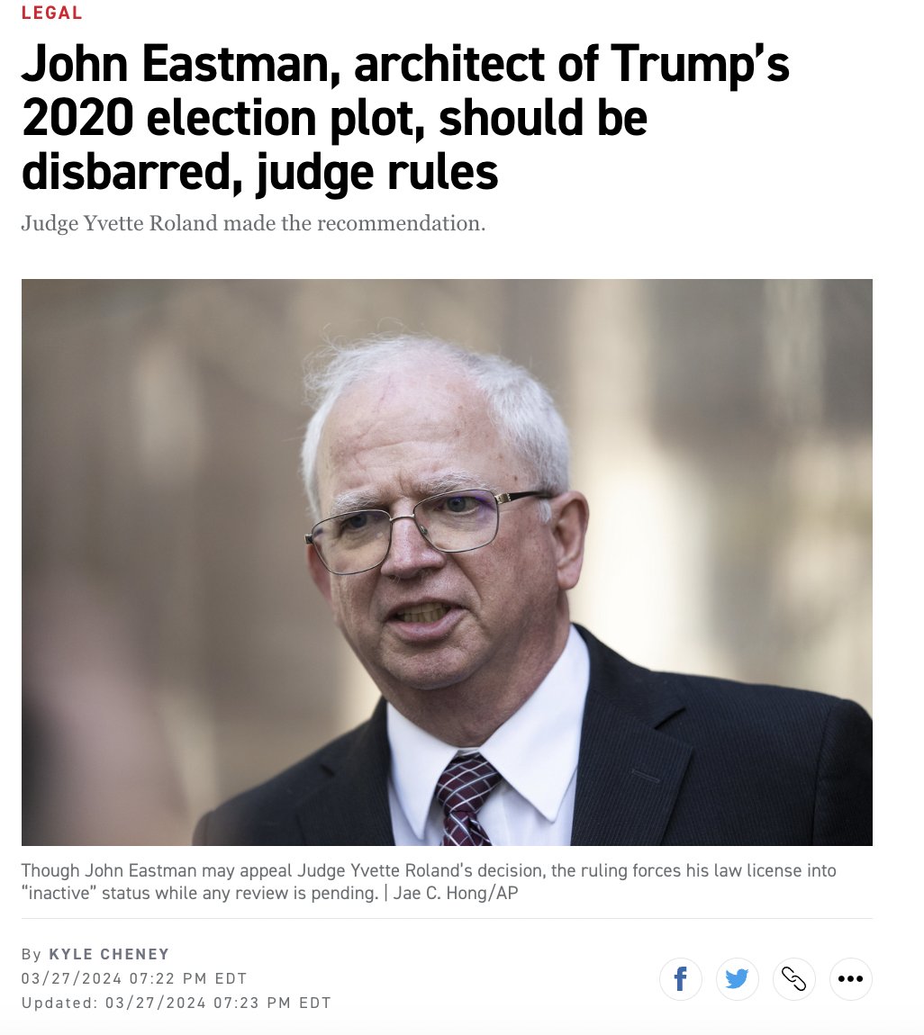 MORE: State bar investigators proved that Eastman conspired with Trump to violate criminal laws and derail the transfer of power, Roland ruled. https://www.politico.com/news/2024/03/27/john-eastman-disbarred-00149468