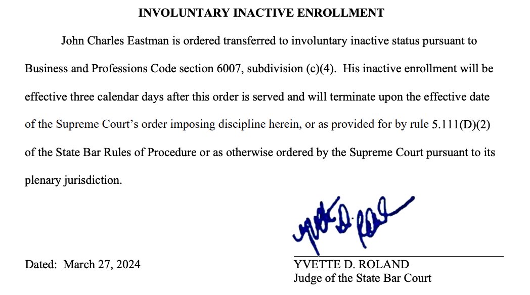 IMPORTANTLY: Though Roland's decision is a "recommendation" to the state Supreme Court, it automatically triggers a process to put Eastman on "inactive" status as an attorney, prohibiting him from practicing law. https://www.politico.com/news/2024/03/27/john-eastman-disbarred-00149468