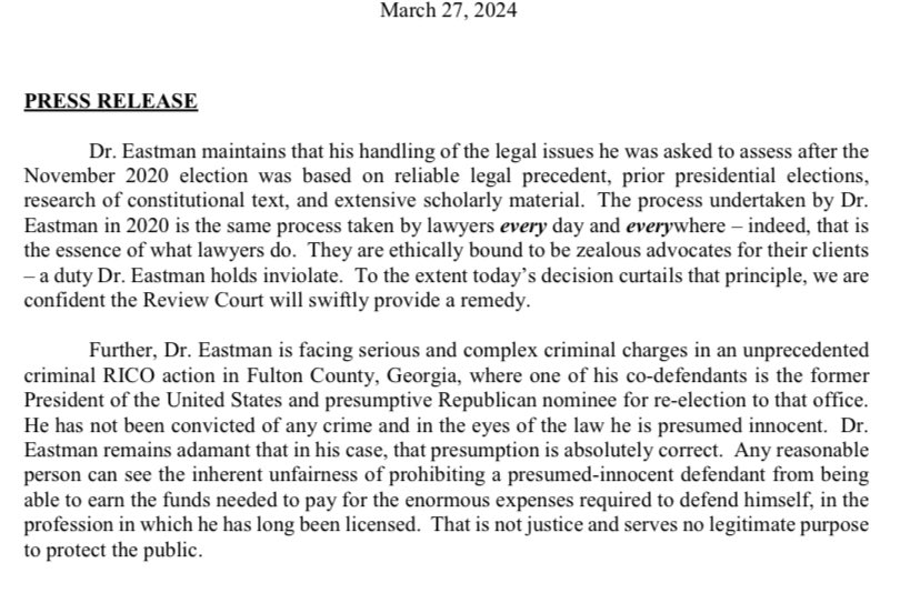 UPDATE: John Eastman plans to appeal the disbarment ruling to a panel of California’s State Bar Court. His lawyer says it’s unfair Eastman should have to fight criminal charges in GA without being able to earn money as a lawyer to pay his legal bills. https://www.politico.com/news/2024/03/27/john-eastman-disbarred-00149468