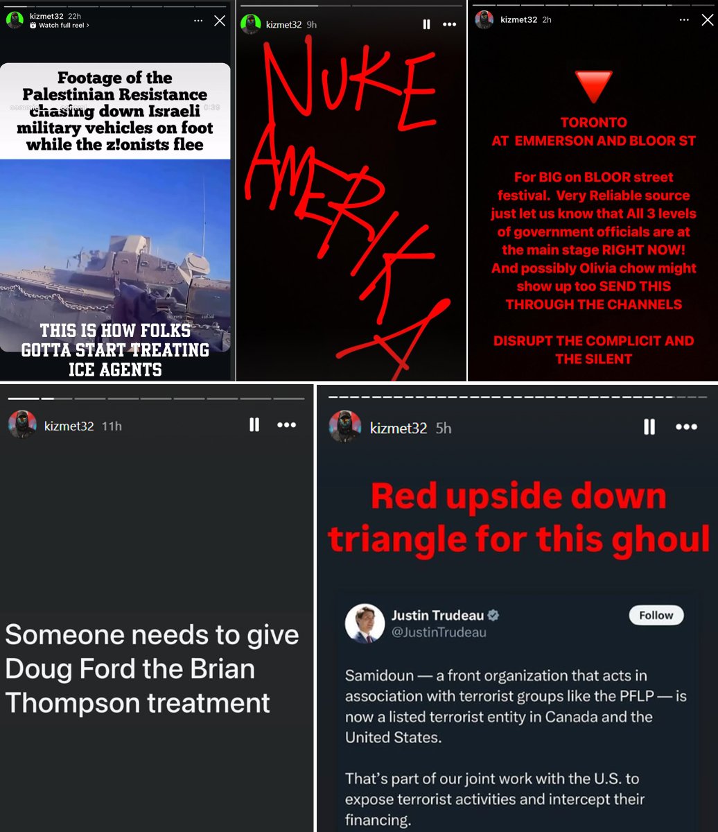 José-Gabriel Sandoval is a Toronto based graffiti artist who goes under the alias “Kizmet.” He is also a radical anarchist calling for the murder of Israelis & political figures in Ontario. José-Gabriel Sandoval calls for another Al-Aqsa Flood, the operational name for Hamas of the October 7th terrorist attacks that killed the most Jews since the Holocaust. He is a supporter of the designated terrorist group. “Zios don’t deserve to live next to anyone ever again” says José-Gabriel Sandoval in one post. “And to those from Colonizer lineage. You better start getting active and collecting your peoples. Cause yall looking real soft and chewy right about now” states José-Gabriel Sandoval in another, despite living in Canada with a Spanish last name. Death to the IDF is a common post or story of José-Gabriel Sandoval, a call to murder Israeli soldiers who have served in Israel, despite military serving being mandatory for all. José-Gabriel Sandoval has called for the murder of Doug Ford @fordnation, stating he should be murdered like Brian Thompson, the healthcare CEO who was murdered by Luigi Mangione. He has also advocated for the assassination of former Prime Minister Justin Trudeau. José-Gabriel Sandoval calls for the nuking of America and that ICE agents should be treated like Hamas soldiers as if they are Israeli soldiers in Gaza. José-Gabriel Sandoval will also post the location of politicians & where they are based off his “sources”, requesting his 15k+ followers to attend marked with the Hamas inverted red triangle of death. This is a Notice of Public interest to the Jewish community of Toronto regarding this individual who calls for further October 7thterrorist attacks, along with law enforcement in regards to José-Gabriel Sandoval’s incitement for violence against politicians. All materials were obtained via publicly available sources & does not contain any forms of private media. @TorontoPolice @TPSOperations @rcmpgrcpolice @RCMPONT @DHSgov @FBI @Safety_Canada