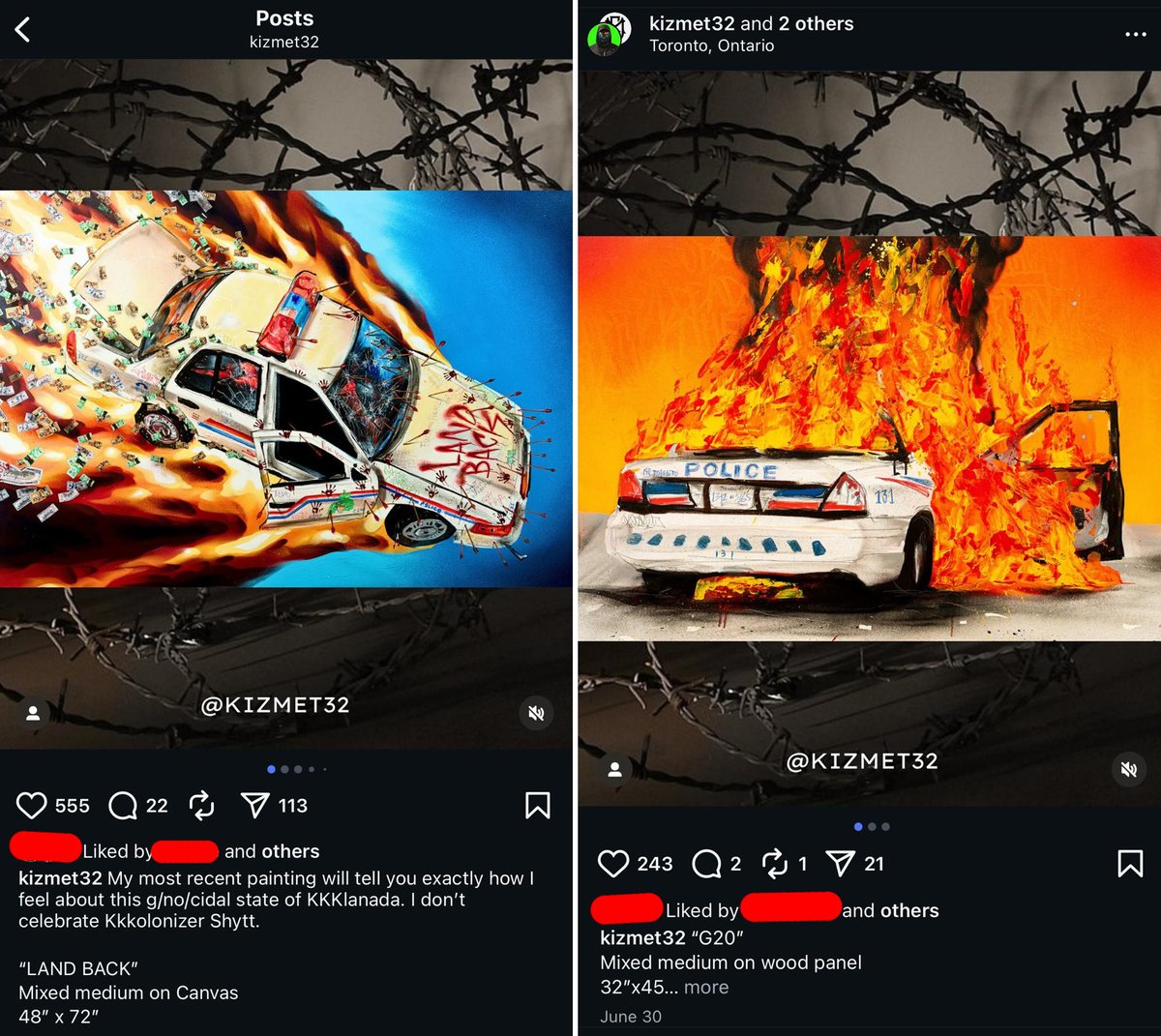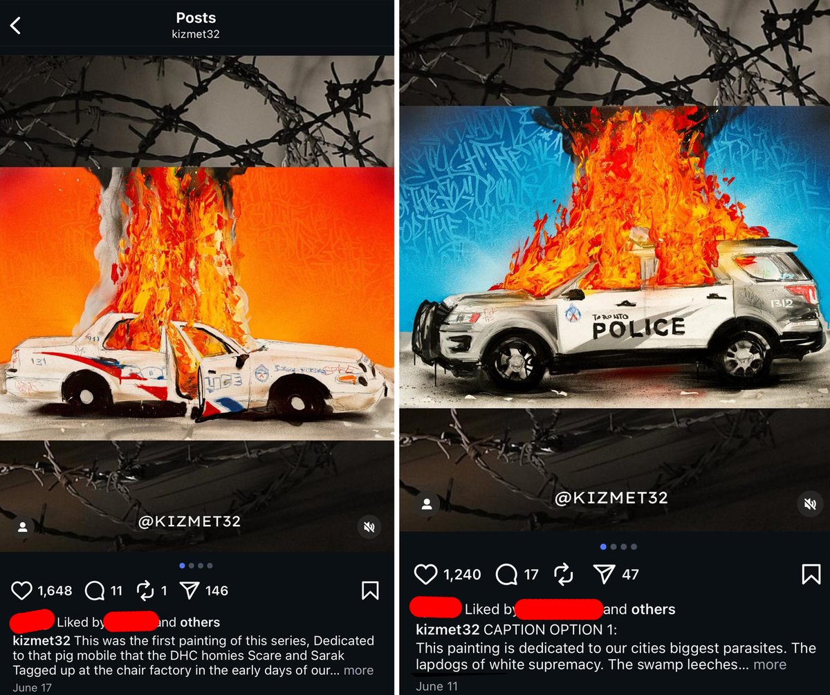 José-Gabriel Sandoval recently had an art exhibit under his alias Kizmet that portrayed @TorontoPolice @TPSOperations vehicles on fire. We wonder what he would like to do to police officers. https://t.co/3XuT0vpIea