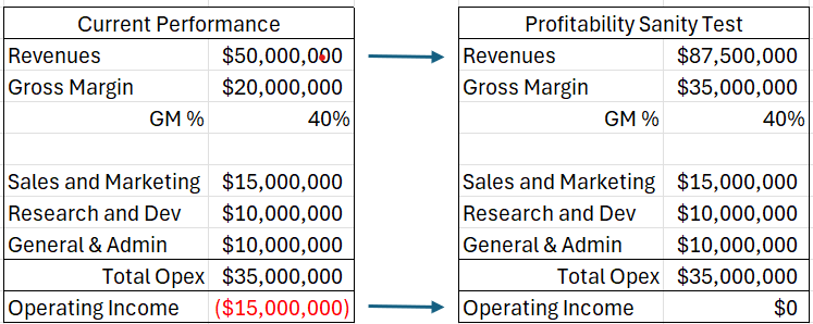 The profitability sanity test for VC-backed unprofitable cos... Ask this question: How much revenue would it take to be breakeven if: -gross margin % is held constant -all opex spend is held constant on a $ basis Is that revenue achievable with no additional cost? In the attached example, the company needs to grow revenues from $50,000,000 to $87,500,000 with no additional expense to be breakeven. That's $37,500,000 of incremental revenue with $0 of added expense. The question for this business is whether that's possible. If the gap seems too large, then to make the gap more attainable there are two levers: -increase gross margin % -reduce operating expense The best means to do that varies by business, but those are the two levers. And this needs to happen while the company is growing revenues. If the gap seems impossible, then you may have a fundamental business model issue that will make profitability a remote possibility. Of course, there are means in which companies can grow to achieve scale which will help with the profitability likelihood over time - but that will require outside capital which should never be treated as a categorically attainable.