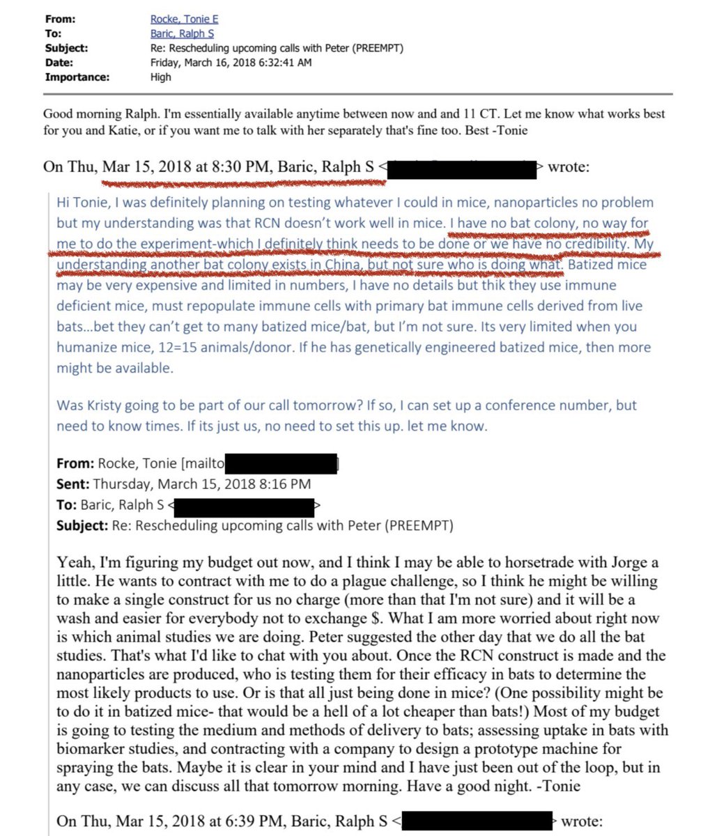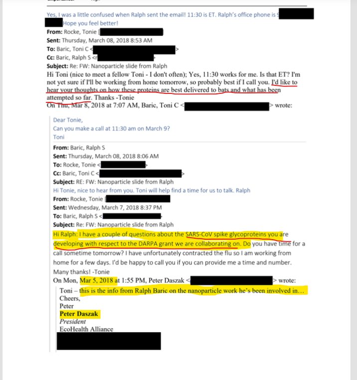 🛑WOW. What were you doing on March 5, 2018? A few were planting the seeds on the gain of function research that turned into the Wuhan lab leak... 🔥🔥Brand new FOIA documents show the VERY first emails in March 2018 where Ralph Baric discusses experiments with the coronavirus and bats. 💥March 5: Peter Daszak makes an email introduction stating that Ralph Baric is working on nanoparticles. 💥March 7: Ralph Baric is asked about SARS-CoV spike glycoproteins he is developing "with respect to the DARPA grant" 💥March 15: Baric states...he was planning on testing what he could in mice, "nanoparticles no problem" he states, but that he understood RCN doesn't work well in mice. "I have no bat colony, no way for me to do the experiment-which I definitely think needs to be done or we have no credibility. My understanding another bat colony exists in China, but not sure who is doing what. " ✅FOIA link with all emails below...