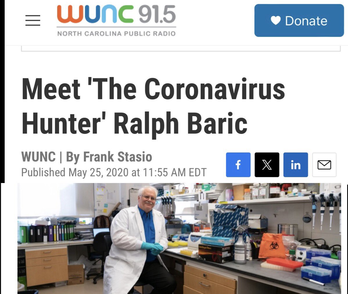 Two years later, in May of 2020, while NYC is getting hit hard with Covid deaths, Ralph Baric speaks on coronavirus research. "Put the 2019 pandemic in perspective...when you look at 7 human coronaviruses that have emerged over the last 800 years, 7 of them came from bats." He is asked... 🛑How is it possible to safely study a dangerous virus? Timestamp: 10:54 🔥🔥Listen: https://www.wunc.org/health/2020-05-25/meet-the-coronavirus-hunter-ralph-baric