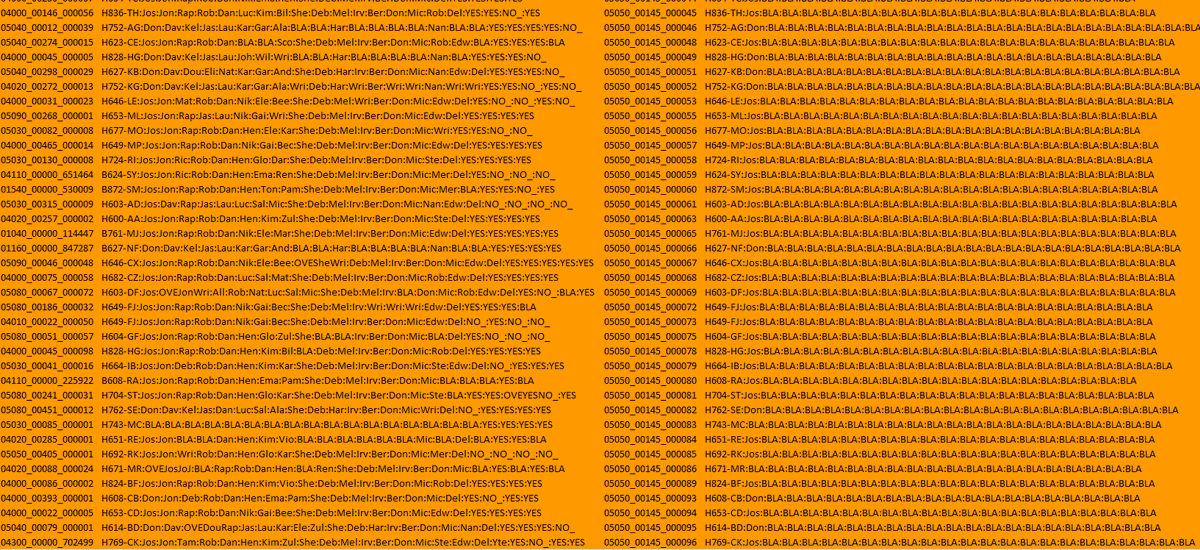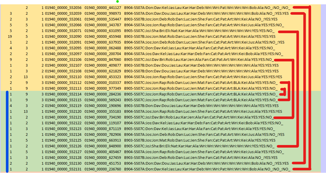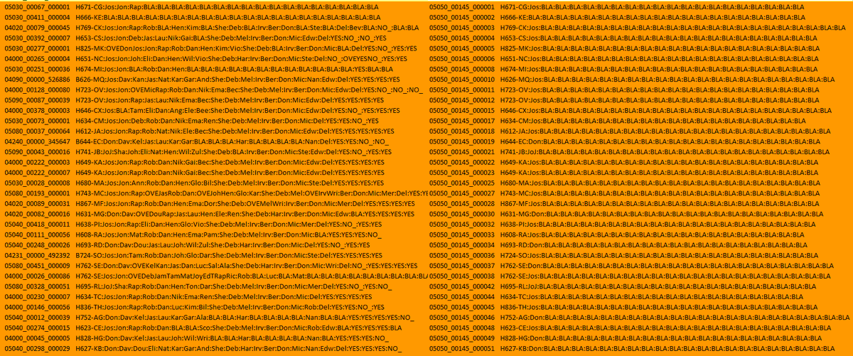 I had several comments in the last month asking how I'm finding the doubled ballots. I just found one of the most interesting cases yet that has me quite baffled. My first step is to convert the voter's candidates to a 'signature' string that makes a semi-unique signature. Next, I compare how many occurrences of this signature appears and record it into the second column. Thankfully a lot of these are showing an occurrence of 2, meaning that this ballot signature is quite unique and only shows up twice in all ballots cast. Then I compare this occurrence number to the recount. if the number of occurrences match both the count and recount, then I filter out that ballot. Any remaining ballots are considered to be an 'aberration' and needs to be visually inspected. Now with this aberration list, I just found a string of 14 ballots that are sequential. Since the voting signature was fairly unique, I searched for the duplicates and they appeared immediately before them in a reverse order. But strangely separated by other ballots. Real double-scanned ballots should always be in reverse order since the tabulator's don't retain page order like normal scanners. So what happened here? Maybe someone was scanning ballots, grabbed a hand full of ballots, picked out the write in ballots, and rescanned them again? All but two of them are write ins. (Look for :Wri:)