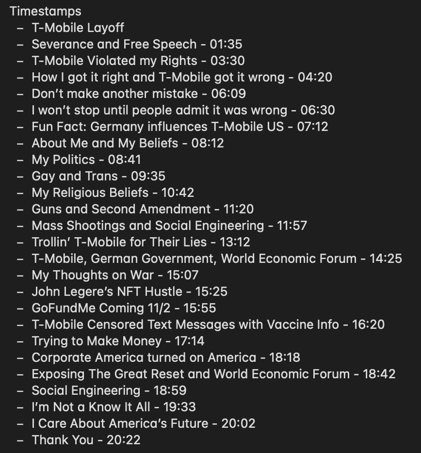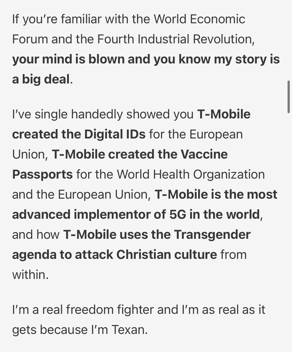 Every American Should Know This About T-Mobile 1. T-Mobile US is an American company whose parent company was once 100% owned by the German Government and they’re a significant partner for the World Economic Forum (WEF). (Moving forward - I’ll refer to T-Mobile US as T-Mobile, and T-Mobile’s parent company in Germany is Deutsche Telekom) 2. T-Mobile is helping destroy America from within by utilizing tactics like Diversity, Equity, and Inclusion (DEI) and Environmental, Social, Governance (ESG) to influence ideological subversion among the American people. 3. T-Mobile lied to America about the merger with Sprint, they used half-truths to mislead everyone. The T-Mobile and Sprint CEOs lied to Congress by promising to create jobs and lower the prices of rate plans for consumers, 2023 proved those statements to be half-truth lies and I’ll show you how. 4. T-Mobile violated my rights as an American in 2021 and 2022. I worked there for 17 years and was recently laid off in August, but my employment extended through November 2, 2023. T-Mobile discriminated against me for being unvaccinated and barred me from entering the office while vaccinated people were allowed to enter the office, this went on for 10 months and in Frisco Texas! 5. T-Mobile was one of the coolest turn around stories in the history of American business, we went from being on the “List of Companies Expected to Die in 2011” to the “Fastest Growing Wireless Company in America”. But now, T-Mobile should be known for being one of the most corrupt wireless companies in America that’s full of Woke ideology it forces onto their employees. 6. One of the many subsidiaries of Deutsche Telekom, T-Systems, helped the World Health Organization and European Union both create their global Vaccine Passport system. They also have a “Customer Data Platform” that seems to be a perfect system to implement a Social Credit Score. 7. T-Mobile laid off 5,000 Americans in Q4 2023 while they were also reporting record earnings and record cashflow. Within 10 days of announcing the layoff, they also launched dividends and stock buybacks to the total of $19 Billion. 8. T-Mobile’s CEO, Mike Sievert, is the highest paid US telecom CEO, Sievert is awarded annual raises 1200% higher than some of his employees, and his CEO ratio pay is 50% higher than the average CEO ratio pay in America. 9. T-Mobile’s old CEO, John Legere, hustled and manipulated people into believing that he cared about taking down the establishment, but in reality, John Legere was the establishment pretending to be the good guy. After leaving T-Mobile in 2020, Legere partnered with Steve Aoki and 3LAU to run an NFT hustle that made them MILLIONS of dollars. 10. Sprint’s CEO, Marcelo Claure, helped implement the merger with T-Mobile. Claure is a key player for the WEF and he partnered with Softbank’s CEO Masayoshi Son to make BILLIONS of dollars together on the merger with T-Mobile. https://www.marcpalasciano.com/p/every-american-should-know-this-about