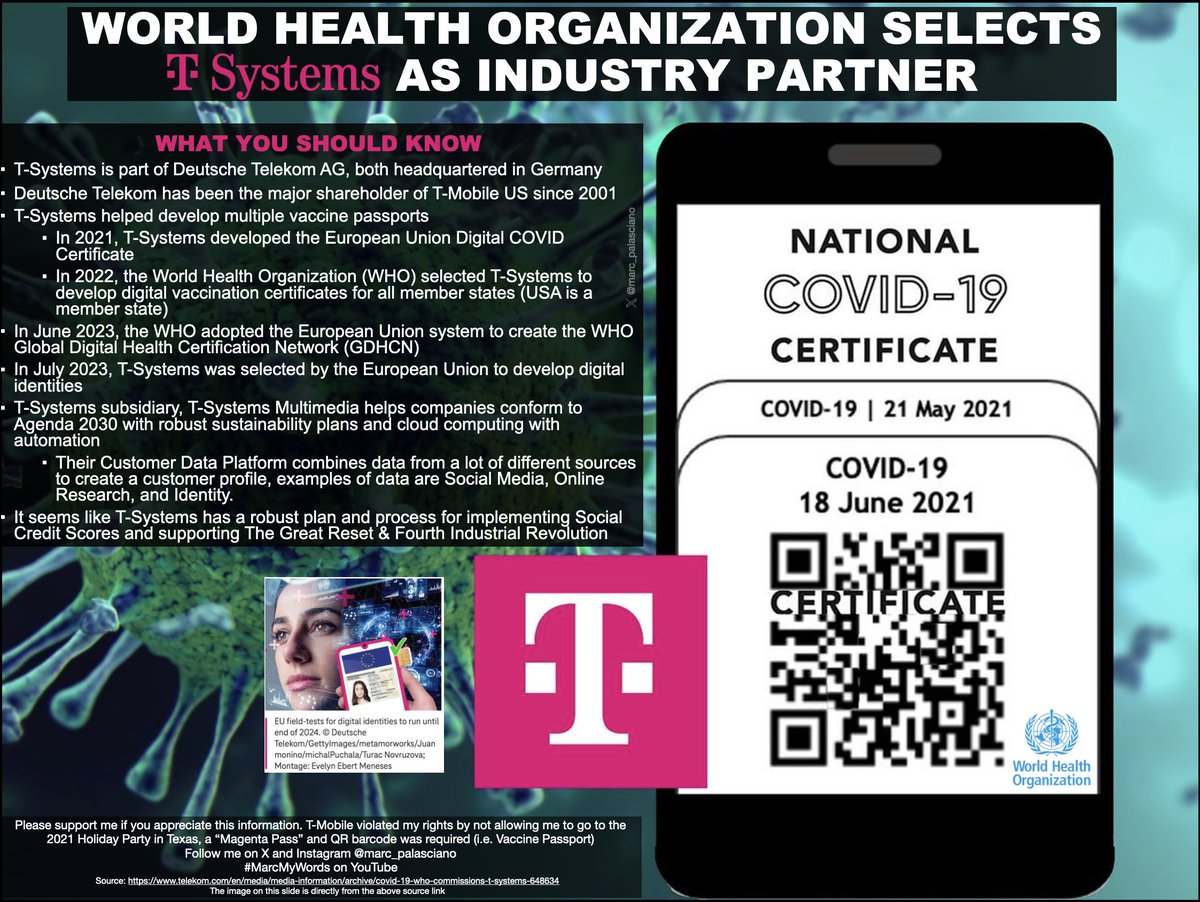 Most people don't know how deep T-Mobile is intertwined into #TheGreatReset and @wef, but I do. - Are you ready to lose your freedom? - Are you ready for the government to control your every move and every dollar you spend with digital currency? - Did you really think COVID was just an accidental pandemic that resulted in the largest transfer of wealth in history, while also launching digital measures to control people? - Did you notice how Artificial Intelligence apps came out of nowhere since 2020? And not just any AI, these apps can pass the bar exam to be a Lawyer, or a medical exam to be a Doctor. - Welcome to the #FourthIndustrialRevolution, where "You'll Own Nothing. And You'll Be Happy". The good news is, humans won't have to work as hard because AI will continue taking over more and more jobs. The bad news is, now a lot less humans are needed on earth. - Did you think Israel/Palestine was an accident? A lot of people don't know that World Wars are a great way to usher in Industrial Revolutions. Meet @tsystemscom, one of @deutschetelekom many subsidiaries. - T-Systems helped both the WHO and European Union with creating vaccine passports and digital identities. - T-Systems has a subsidiary, T-Systems Multimedia Solutions that helps companies conform to Agenda 2030 with robust sustainability plans and cloud computing with automation. - One of my favorite apps T-Systems created is the Customer Data Platform. It combines data from a lot of different sources to create a customer profile. e.g. Social Media, Online Searches, Identity, and Banking. - Nice work T-Systems! It looks like y'all have a robust Social Credit Score system ready to go - I personally experienced being discriminated against by T-Mobile in Texas, I was not allowed to attend a Holiday Party in 2021 due to being unvaccinated, and a "Magenta Pass" and QR barcode were required for entry. (i.e. Vaccine Passport) If you read all of that - I appreciate you!! Please follow me if you appreciated this. My entry into independent journalism is in a video below this post. It's a quick intro to let you know how I think about a few big topics in today's society. I'm brand new at this, I welcome your feedback, suggestions, and even roasting and trolling. #MarcMyWords