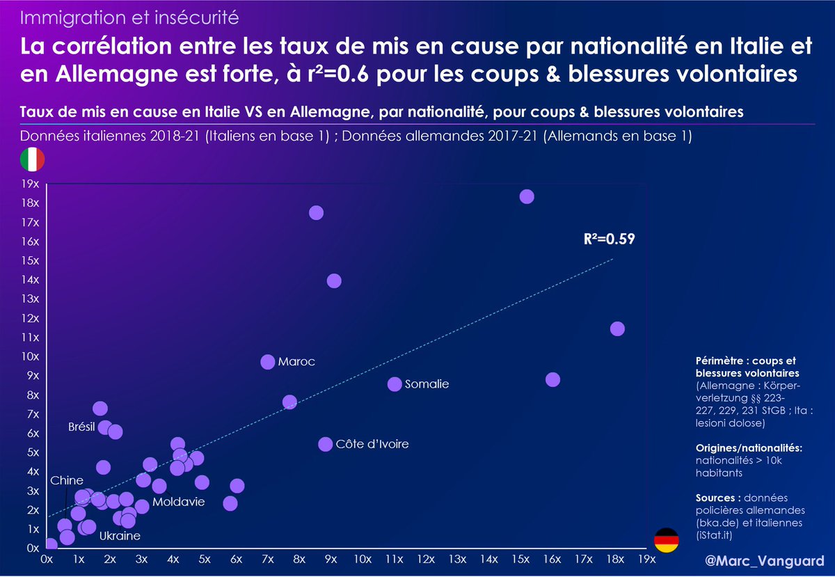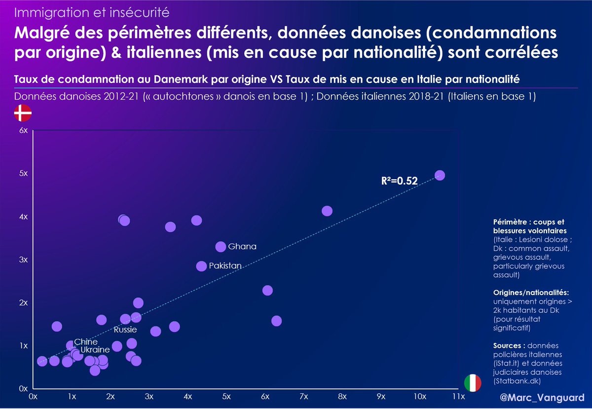 Le Danemark publie aussi des données, mais avec une définition différente : il s’agit de condamnations, et par origine (immigrés et descendants). 🟣 Et pourtant, la corrélation avec les données de mis en cause par nationalité en Italie est significative ! ⬇️ https://t.co/anUx1uk0ZM