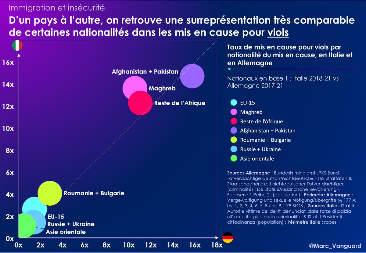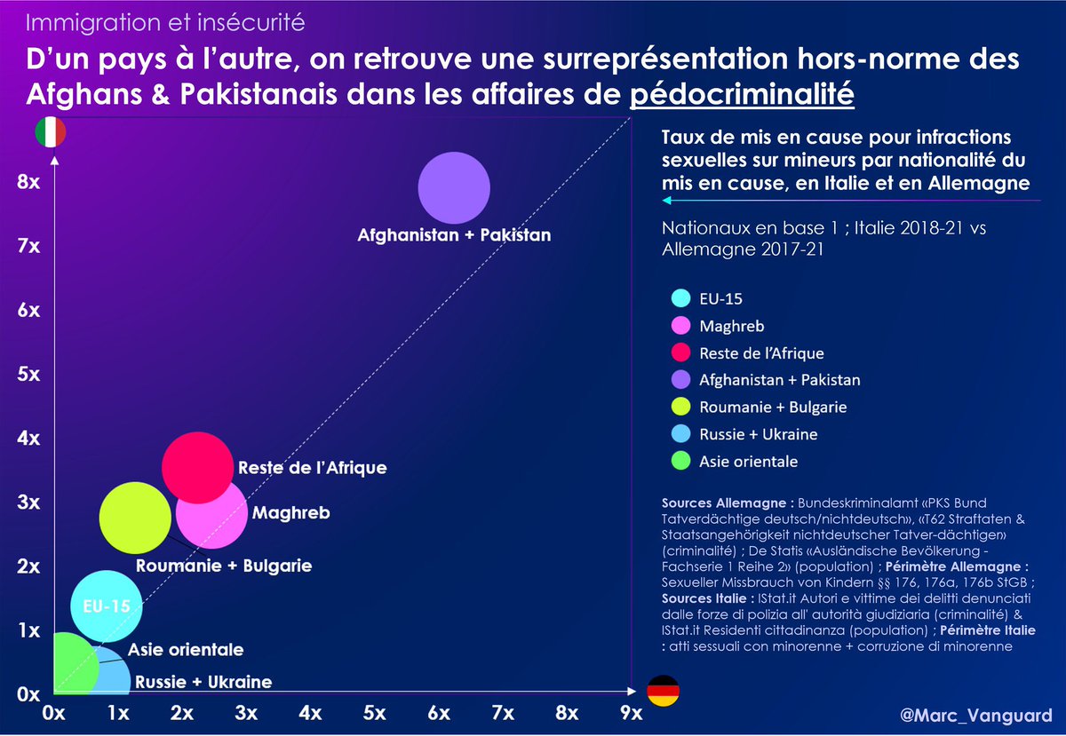 On observe en 🇮🇹 et en 🇩🇪 la même particularité concernant les infractions sexuelles : la surreprésentation des Afghans et Pakistanais, qui sont proportionnellement ~15x + mis en cause pour viols que les ressortissants nationaux ! https://t.co/SP1cRZcvYU