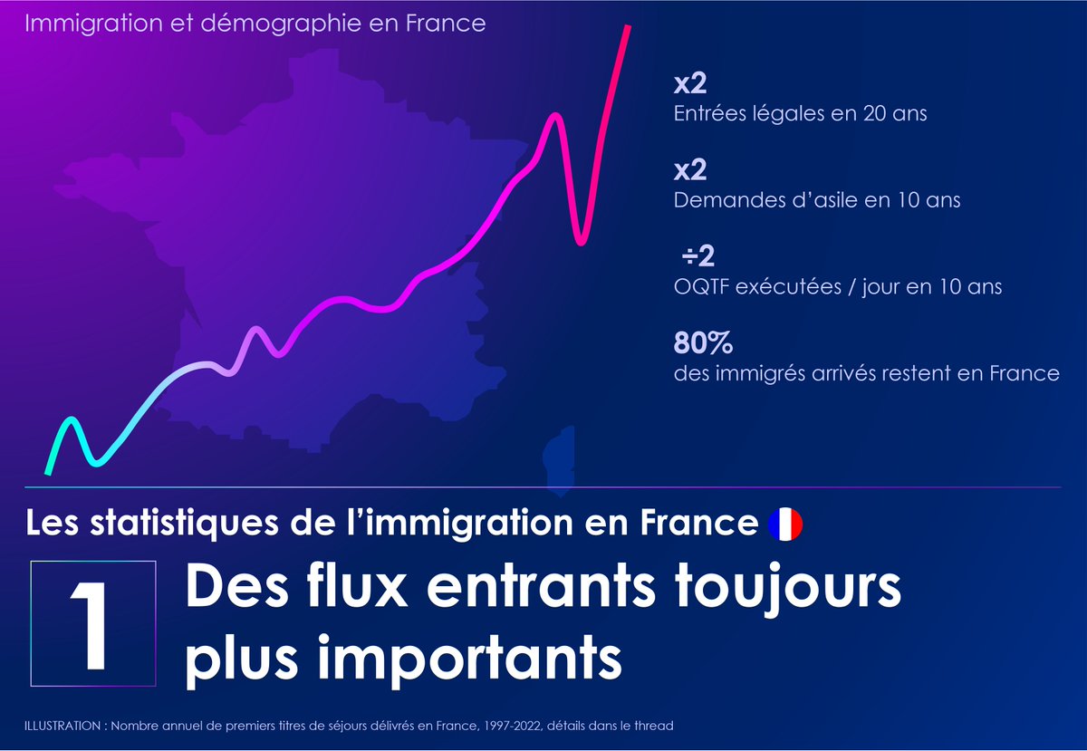 🚨 THREAD : Les chiffres de l'immigration en France Chapitre 1 : des flux entrants toujours plus importants 👉Combien d'immigrés arrivent en France ? De quels pays ? Pour quels motifs ? Toutes les réponses dans ce fil en 12 infographies choc ⬇️