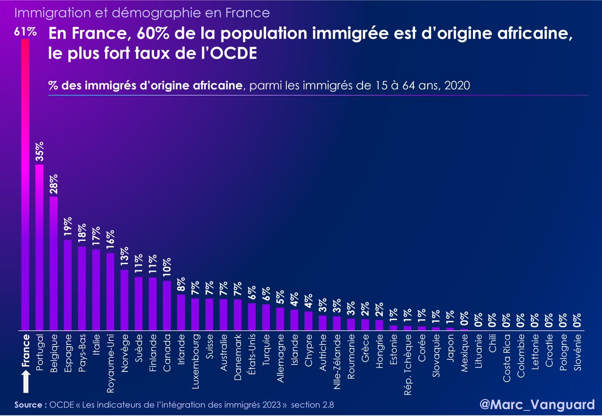 3⃣ La France est aussi le 1er pays de l'OCDE pour l'immigration africaine. 👉 Celle-ci représente 61% des immigrés en France, contre 35% pour le Portugal, qui arrive pourtant 2e. https://t.co/EtfaPCSvj5