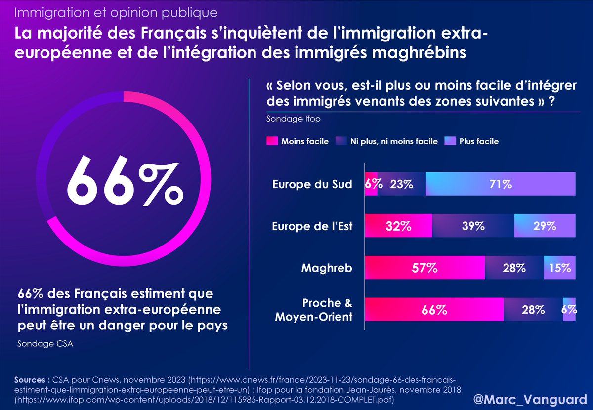 1⃣1⃣ Pourtant, les Français s'inquiètent de l'immigration extra-européenne. 👉 2/3 d'entre eux considèrent qu'elle peut être dangereuse 👉57% d'entre eux estiment qu'il est moins facile d'intégrer des immigrés maghrébins https://t.co/88TiIVlBMr